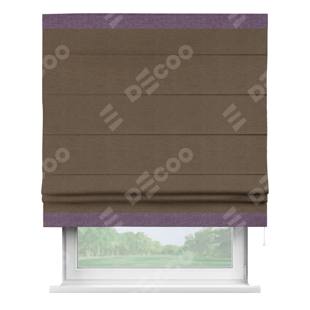 Римская штора производителя «Cortin», используется для проёма, пошита из ткани лён димаут тёмно-коричневый, артикул 83030. Отделка шторы кантом «Горизонт», ткань для канта используется из льна димаут разной расцветки на выбор. Имеет универсальный механизм и подходит для монтажа: на потолок, на стену и в нишу.