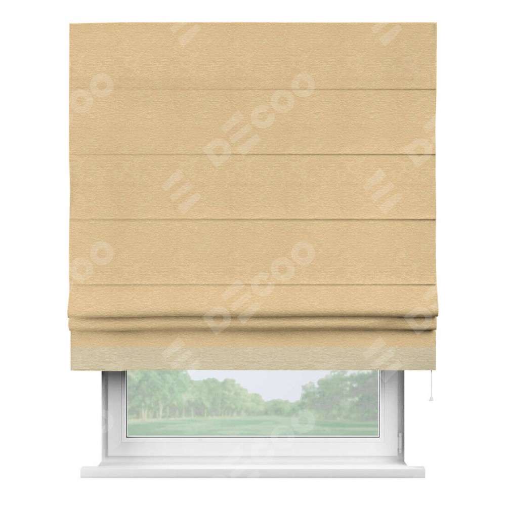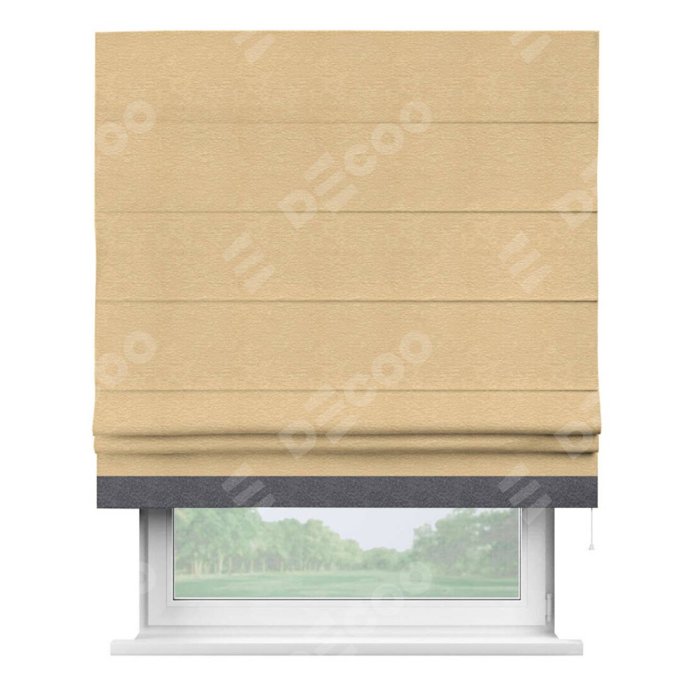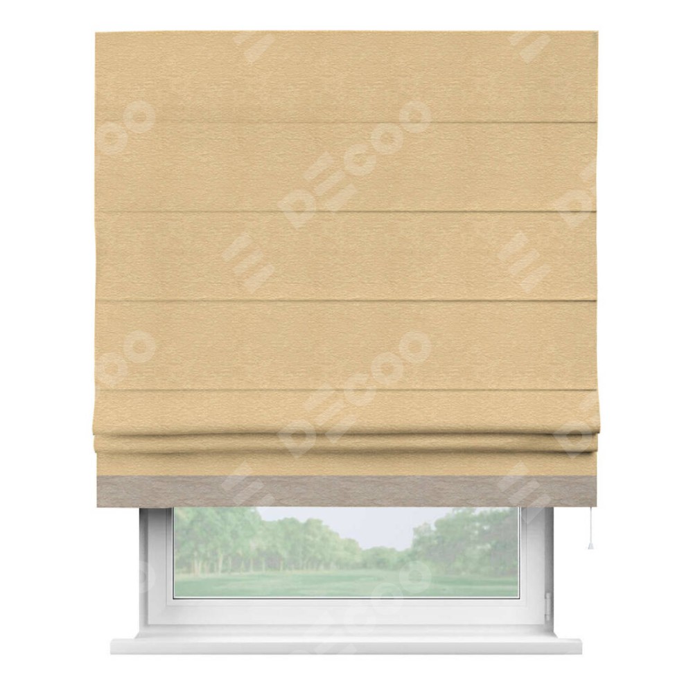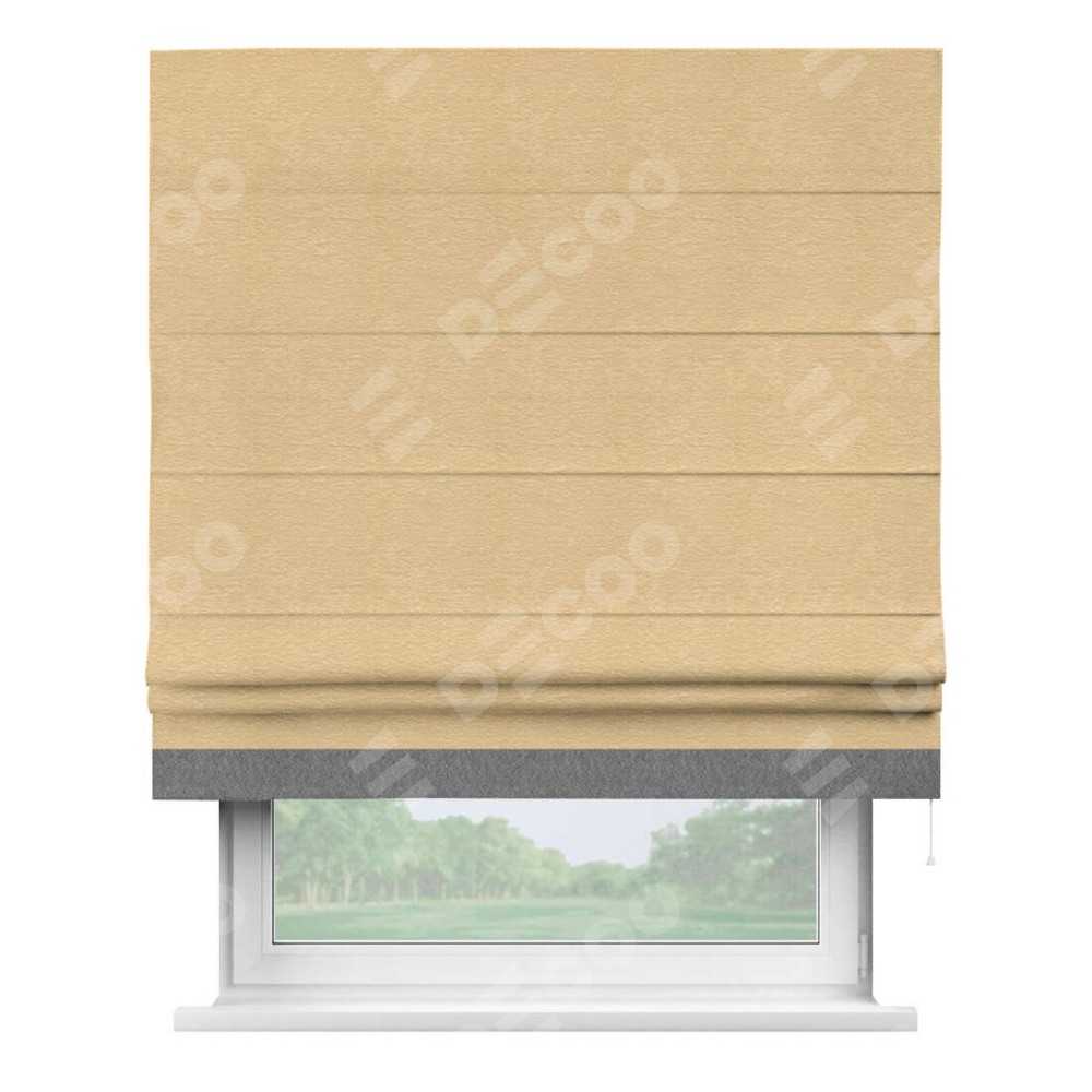 Римская штора производителя «Cortin», используется для проёма, пошита из ткани софт однотонный бежевый, артикул 4202 05. Отделка шторы кантом «Джестер», ткань для канта используется из софта разной расцветки на выбор. Имеет универсальный механизм и подходит для монтажа: на потолок, на стену и в нишу.