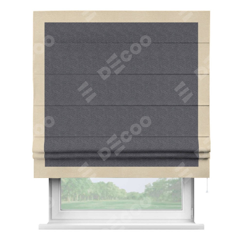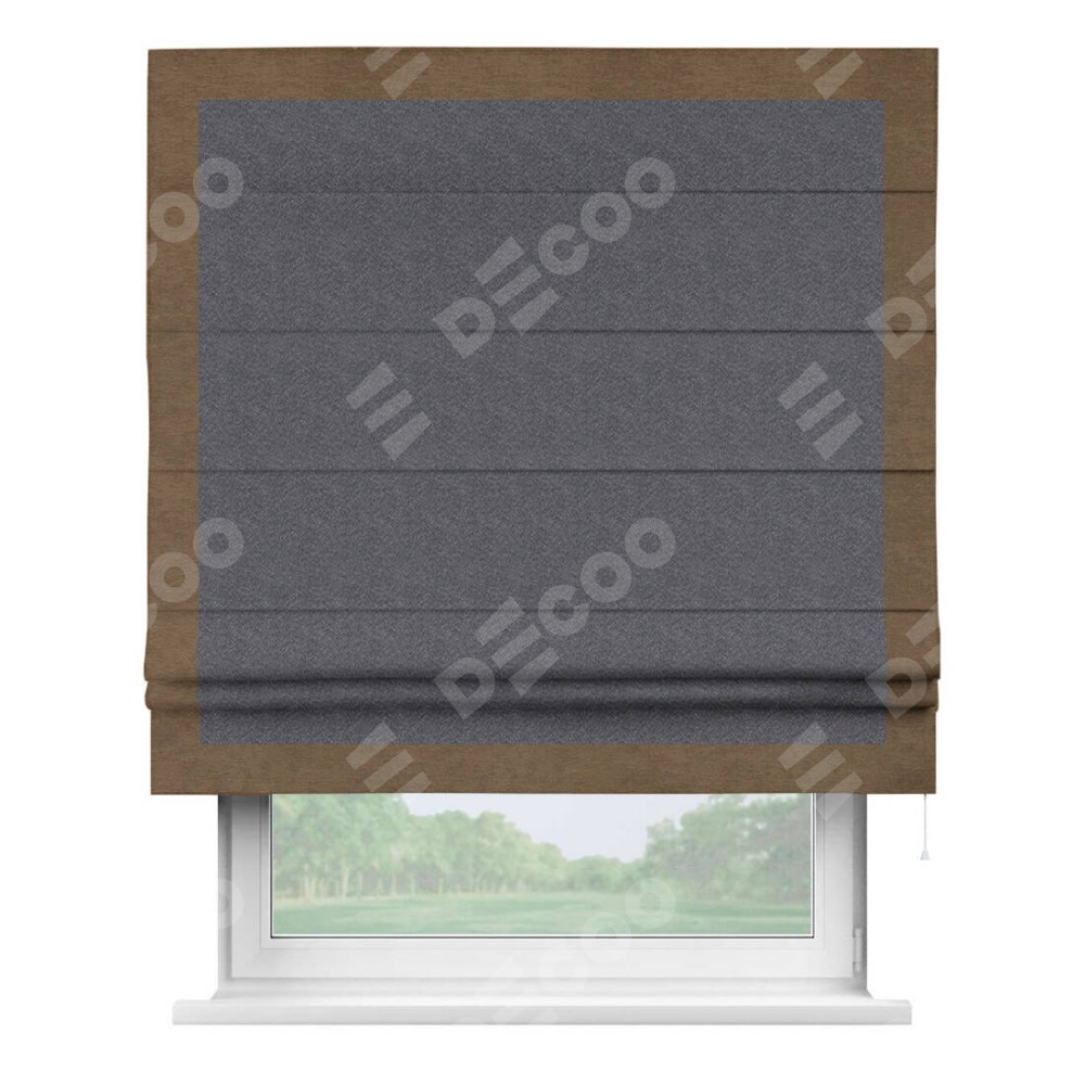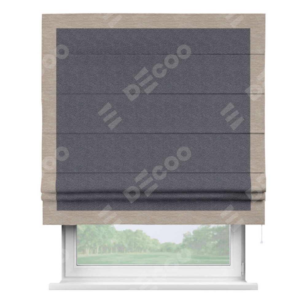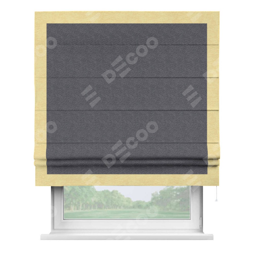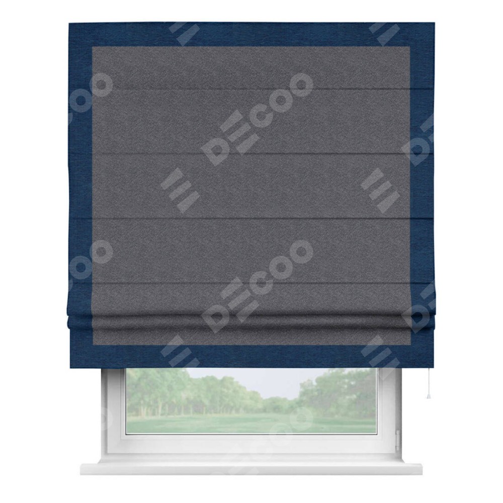 Римская штора производителя «Cortin», используется для проёма, пошита из ткани софт однотонный графит, артикул 19316. Отделка шторы кантом «Чесс», ткань для канта используется из софта разной расцветки на выбор. Имеет универсальный механизм и подходит для монтажа: на потолок, на стену и в нишу.