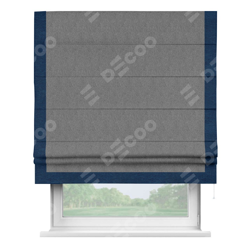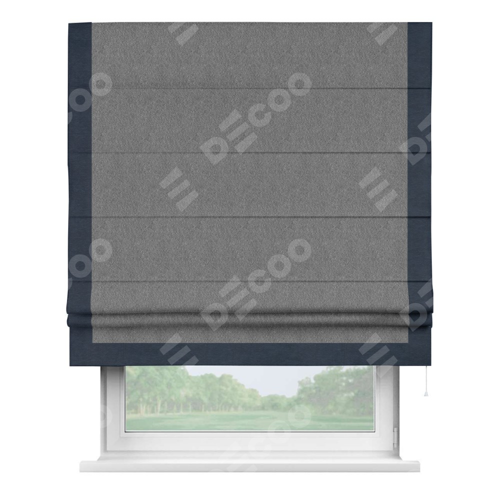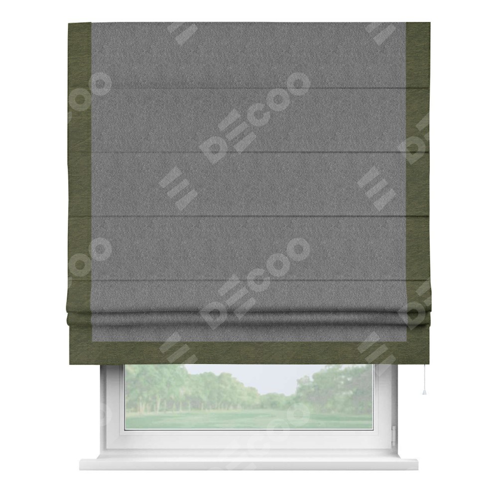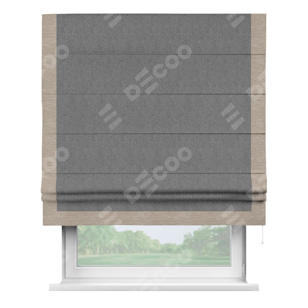 Римская штора производителя «Cortin», используется для проёма, пошита из ткани софт однотонный серый, артикул 70605. Отделка шторы кантом «Виктория», ткань для канта используется из софта разной расцветки на выбор. Имеет универсальный механизм и подходит для монтажа: на потолок, на стену и в нишу.