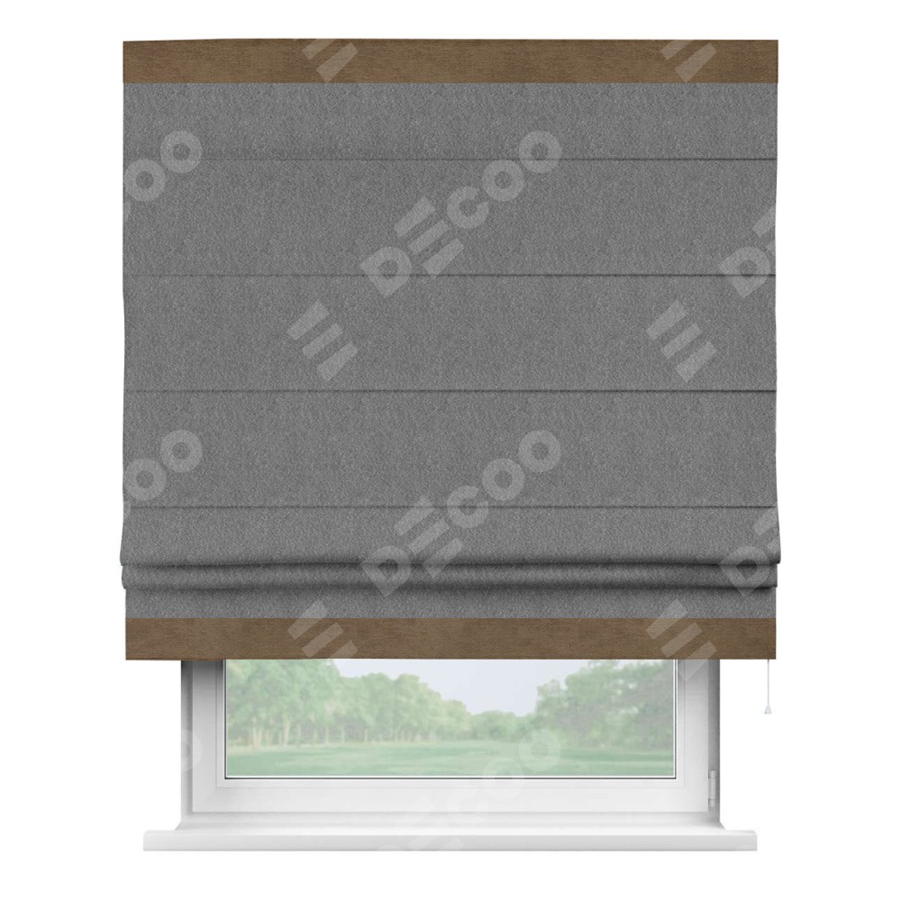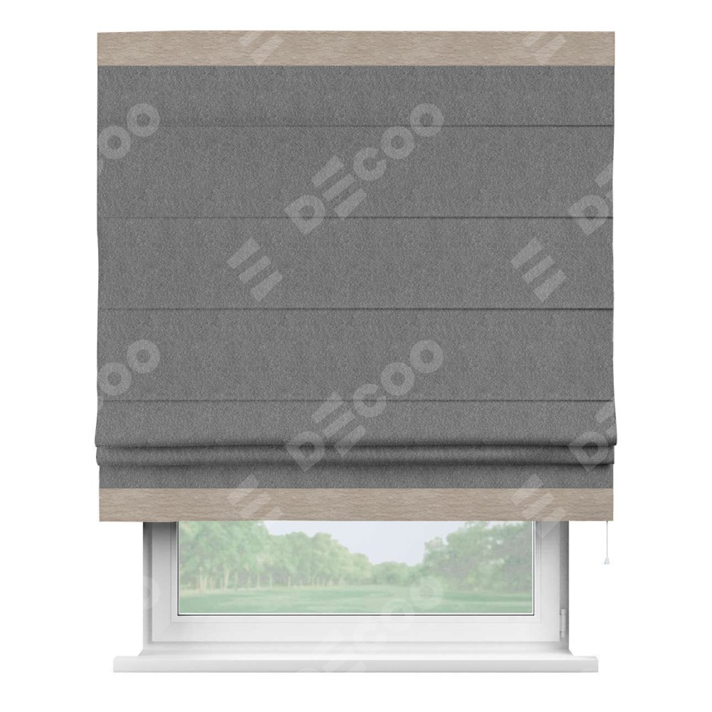Римская штора производителя «Cortin», используется для проёма, пошита из ткани софт однотонный серый, артикул 70605. Отделка шторы кантом «Горизонт», ткань для канта используется из софта разной расцветки на выбор. Имеет универсальный механизм и подходит для монтажа: на потолок, на стену и в нишу.