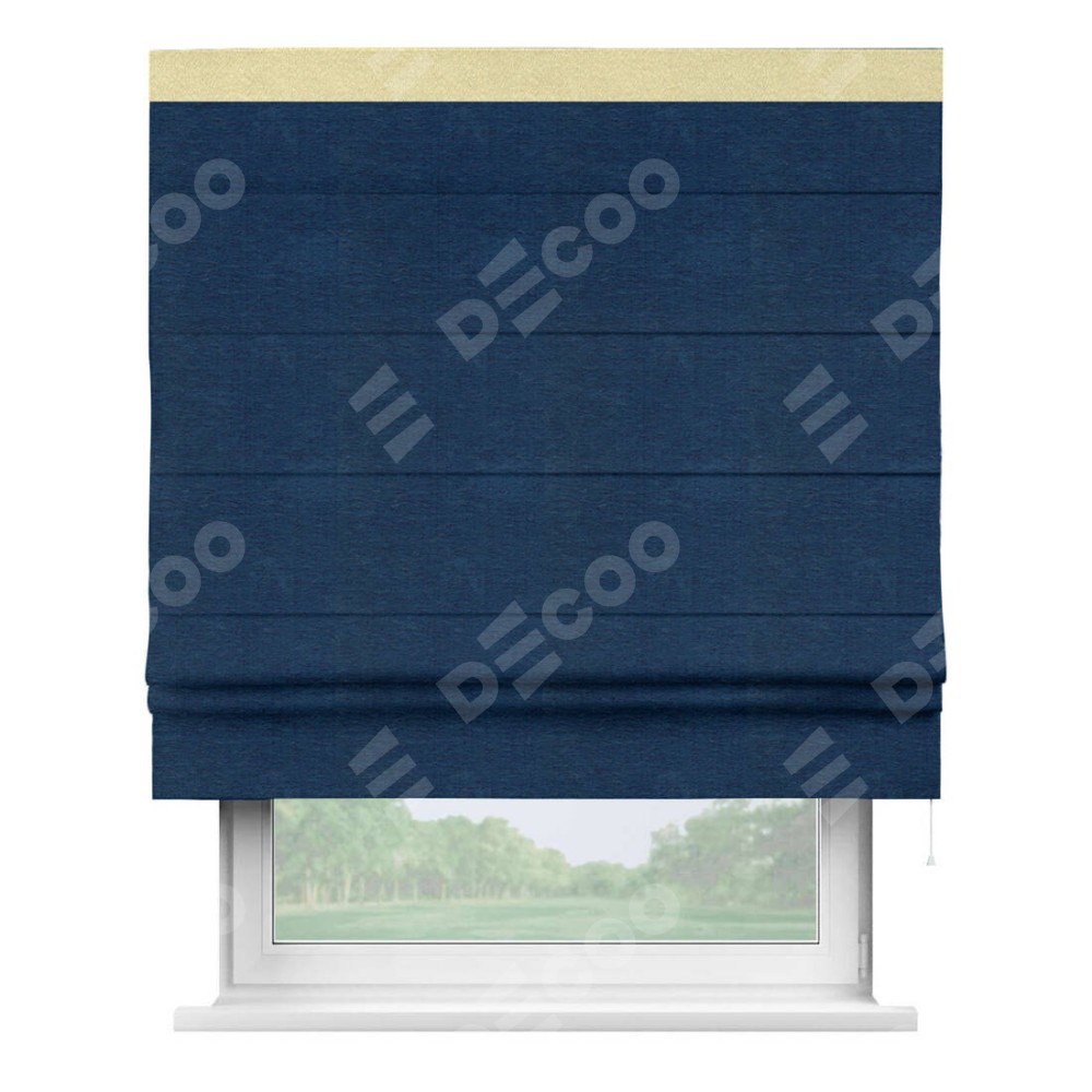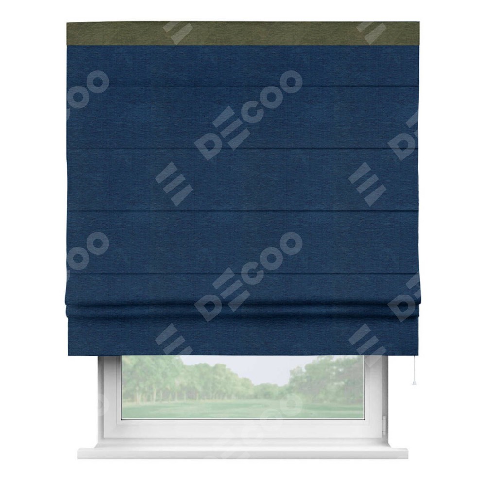 Римская штора производителя «Cortin», используется для проёма, пошита из ткани софт однотонный синий, артикул 42937. Отделка шторы кантом «Кинг», ткань для канта используется из софта разной расцветки на выбор. Имеет универсальный механизм и подходит для монтажа: на потолок, на стену и в нишу.
