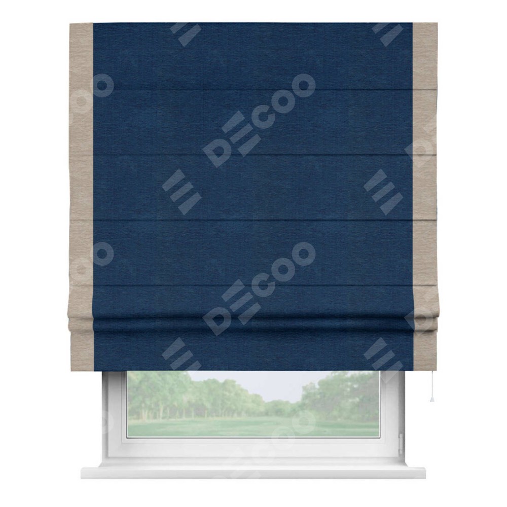 Римская штора производителя «Cortin», используется для проёма, пошита из ткани софт однотонный синий, артикул 42937. Отделка шторы кантом «Стрим Дуо», ткань для канта используется из софта разной расцветки на выбор. Имеет универсальный механизм и подходит для монтажа: на потолок, на стену и в нишу.