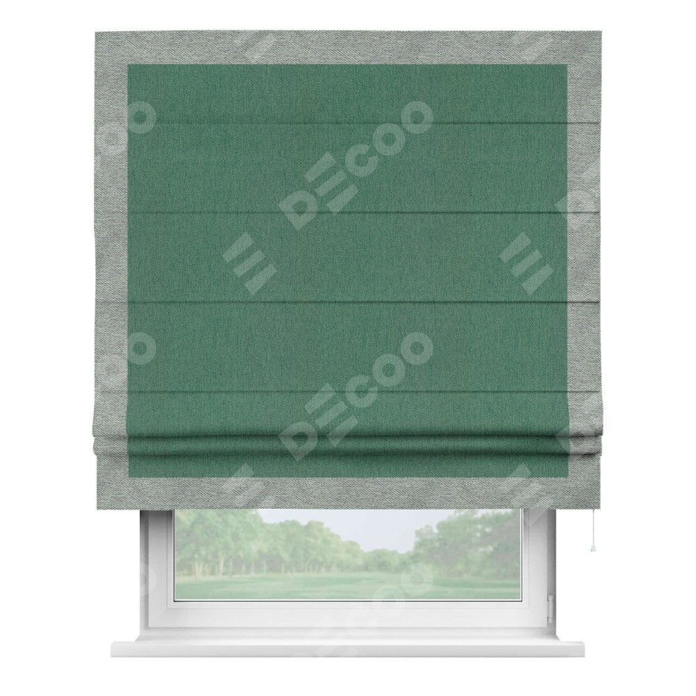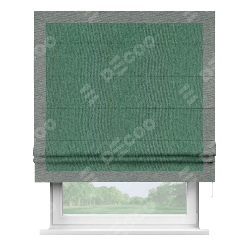 Римская штора производителя «Cortin», используется для проёма, пошита из ткани твид блэкаут зелёный, артикул 21589. Отделка шторы кантом «Чесс», ткань для канта используется из твида разной расцветки на выбор. Имеет универсальный механизм и подходит для монтажа: на потолок, на стену и в нишу.