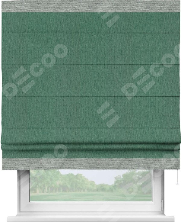 Римская штора производителя «Cortin», используется для проёма, пошита из ткани твид блэкаут зелёный, артикул 21589. Отделка шторы кантом «Горизонт», ткань для канта используется из твида разной расцветки на выбор. Имеет универсальный механизм и подходит для монтажа: на потолок, на стену и в нишу.