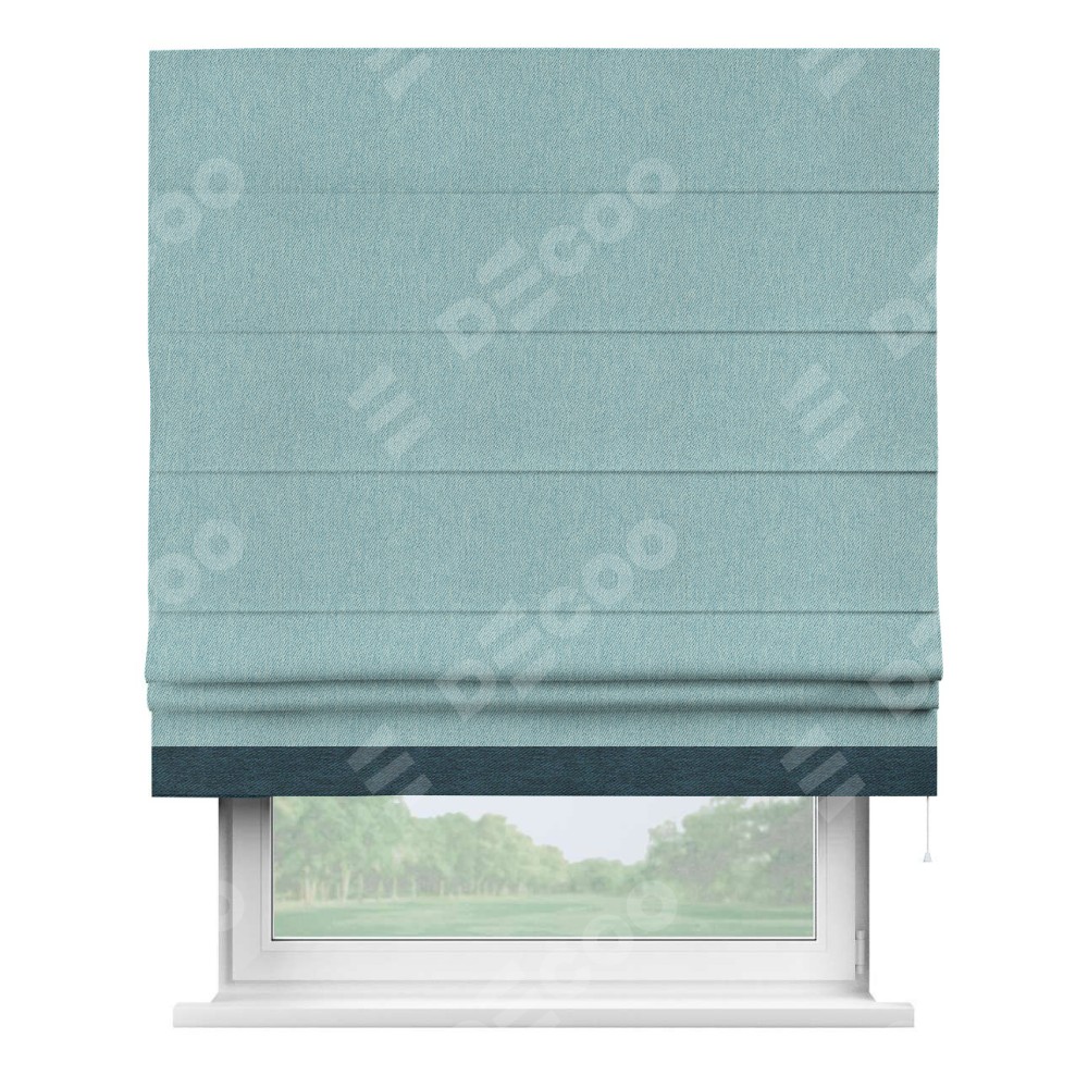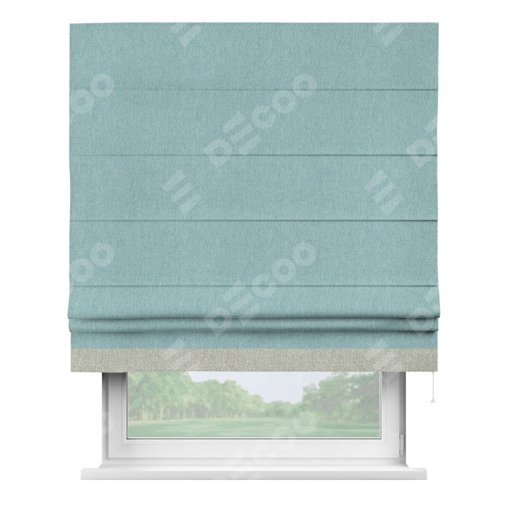 Римская штора производителя «Cortin», используется для проёма, пошита из ткани твид блэкаут небесно-голубой, артикул 21578. Отделка шторы кантом «Джестер», ткань для канта используется из твида разной расцветки на выбор. Имеет универсальный механизм и подходит для монтажа: на потолок, на стену и в нишу.