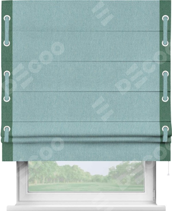 Римская штора производителя «Cortin», используется для проёма, пошита из ткани твид блэкаут небесно-голубой, артикул 21578. Отделка шторы кантом «Стрим Дуо» на кантах расположены люверсы с пояском, ткань для канта используется из твида разной расцветки на выбор. Ткань для пояска обычно используется из основной ткани шторы, а так же можно сделать из любой расцветки по желанию. Имеет универсальный механизм и подходит для монтажа: на потолок, на стену и в нишу.