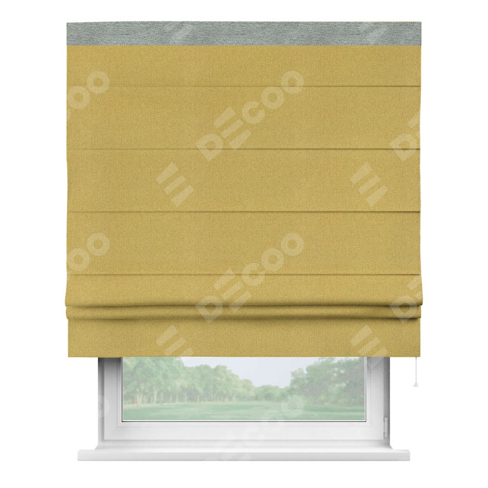 Римская штора производителя «Cortin», используется для проёма, пошита из ткани твид блэкаут пыльная горчица, артикул 21588. Отделка шторы кантом «Кинг», ткань для канта используется из твида разной расцветки на выбор. Имеет универсальный механизм и подходит для монтажа: на потолок, на стену и в нишу.