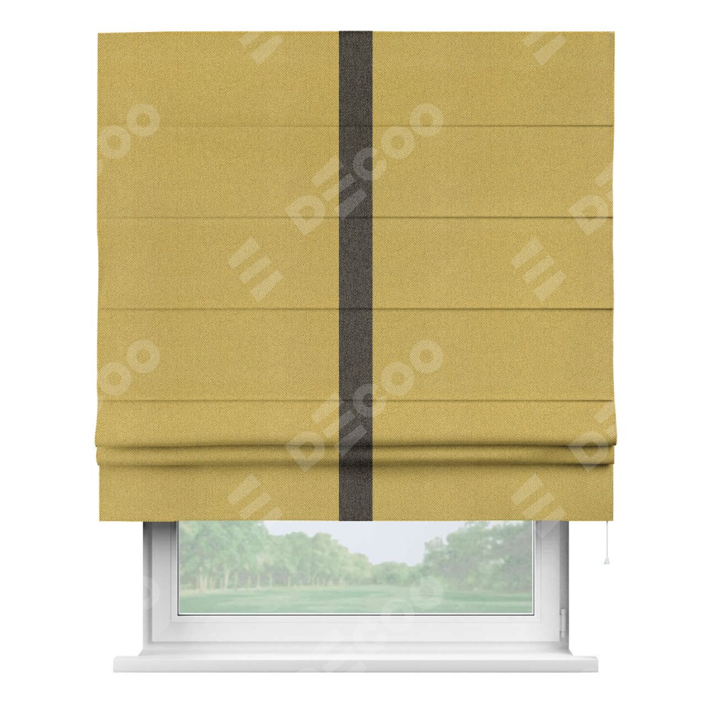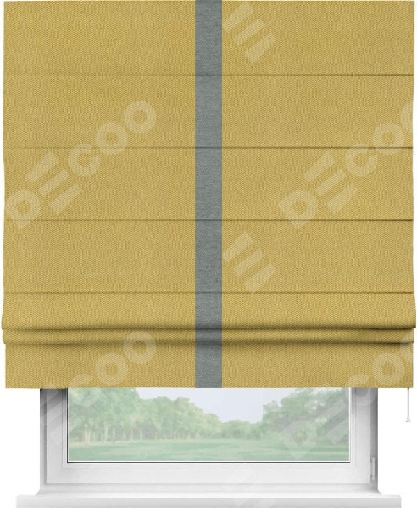 Римская штора производителя «Cortin», используется для проёма, пошита из ткани твид блэкаут пыльная горчица, артикул 21588. Отделка шторы кантом «Хайвэй», ткань для канта используется из твида разной расцветки на выбор. Имеет универсальный механизм и подходит для монтажа: на потолок, на стену и в нишу.