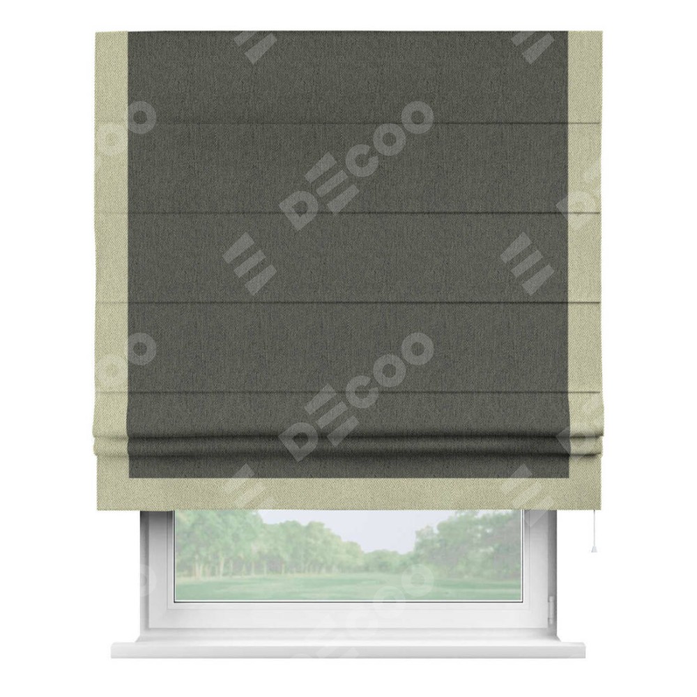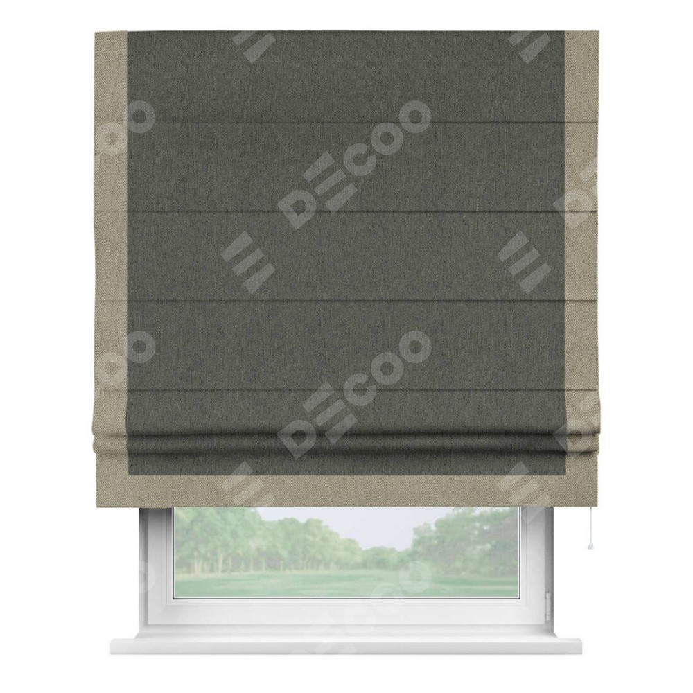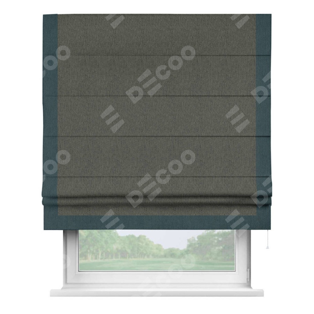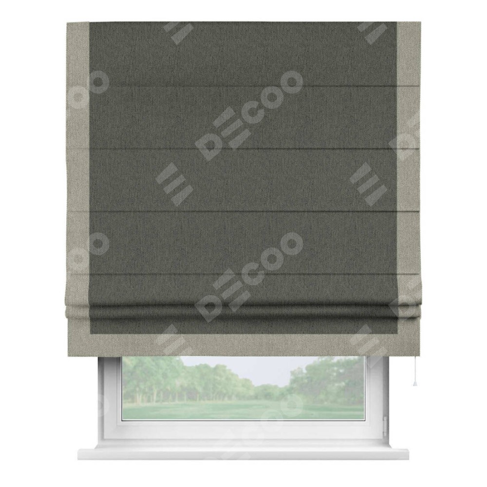 Римская штора производителя «Cortin», используется для проёма, пошита из ткани твид блэкаут тёмно-серый, артикул 21587. Отделка шторы кантом «Виктория», ткань для канта используется из твида разной расцветки на выбор. Имеет универсальный механизм и подходит для монтажа: на потолок, на стену и в нишу.
