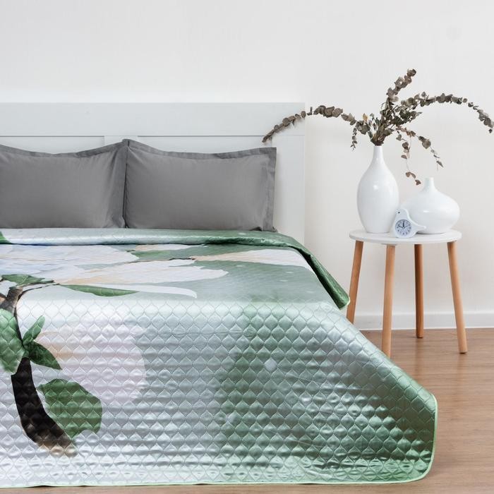 Характеристики: Ткань искусственный шелк, плотность 107 гр/м2, активное (стойкое) крашение. Верх покрывала — набивной рисунок в виде панно, низ — однотонная ткань. Края обработаны шелковой бейкой, упаковка прозрачный чемодан ПВХ с большим вкладышем.