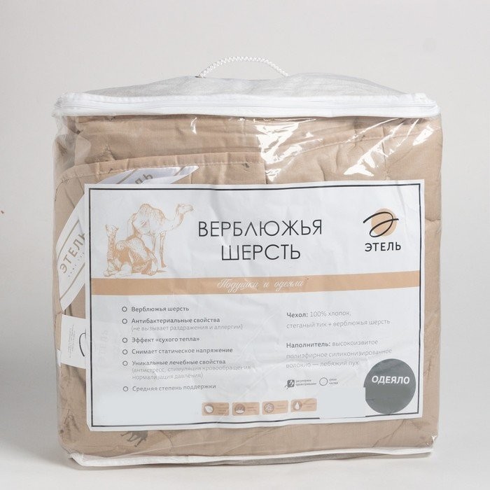 Утеплитель: верблюжья шерсть 50%, лебяжий пух (высокоизвитое полиэфирное силиконизированное волокно) 50%, плотность наполнителя 300 г/м².