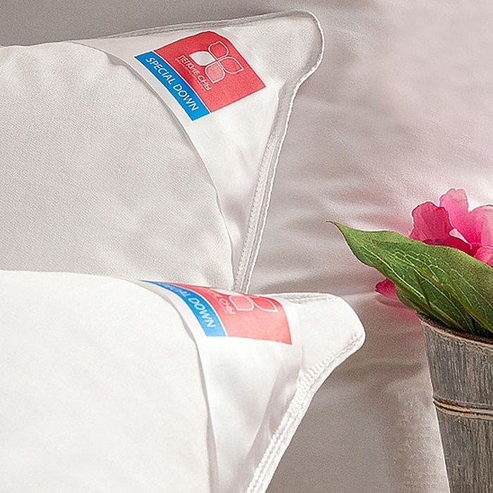 Натуральный гусиный пух и перо первой категории, чехол их прочного пуходержащего твила с белоснежным шёлковым кантом по краям — это всё Подушка «Искушение» 50×70 см, 75−80% гусиный пух, 20−25% гусиное перо, твил 100% хлопок.