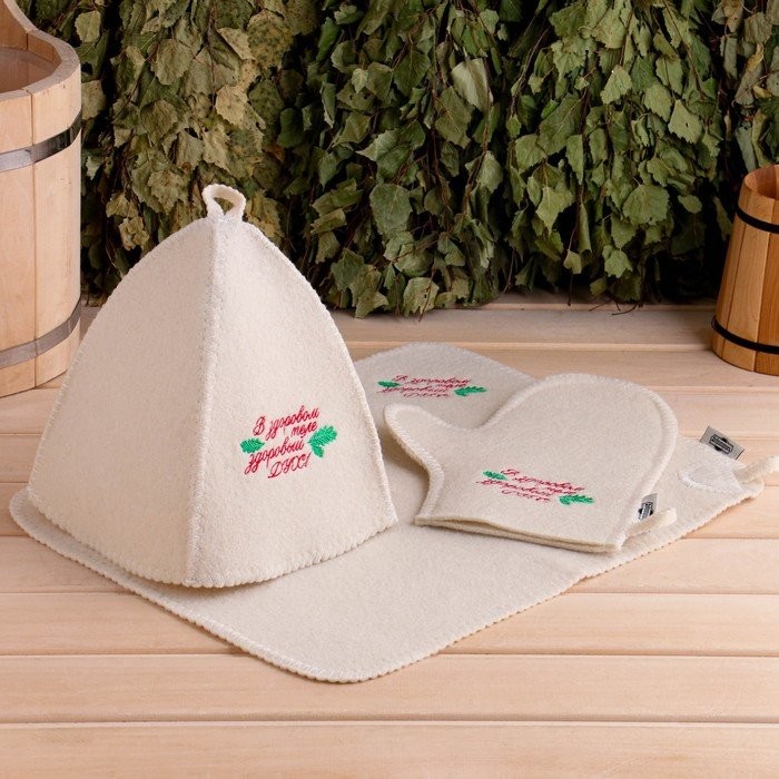 Для комфортного отдыха в парной возьмите с собой набор банных принадлежностей. Предметы из этого комплекта предохраняют тело от перегрева и являются средствами индивидуального пользования. Влажные изделия рекомендуется сушить в расправленном виде на горизонтальной поверхности. Принадлежности из войлока и фетра стирайте вручную при температуре воды 30 °C.