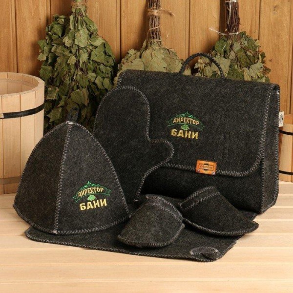 В портфеле можно хранить банные принадлежности и средства личной гигиены. Банная шапка защитит голову от перегрева, волосы от ломкости, а рукавица — от случайных ожогов.