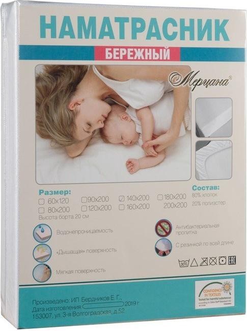 Бережный наматрасник изготовлен из ткани мулетон (80% хлопка и 20% п/э). Изделие превосходно защищает спальное место от непредвиденных ситуаций, так как в его структуре находится водонепроницаемая мембрана.